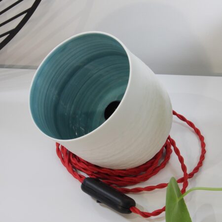 Abat-jour tourné et décoré à la main en porcelaine, rehaussé d’un cabochon en hêtre tourné.