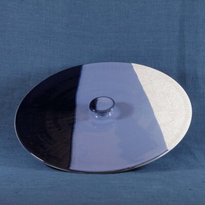 Plateau à fromage (ou à dessert), en grès, tourné et émaillé bleu cobalt et blanc nacré.